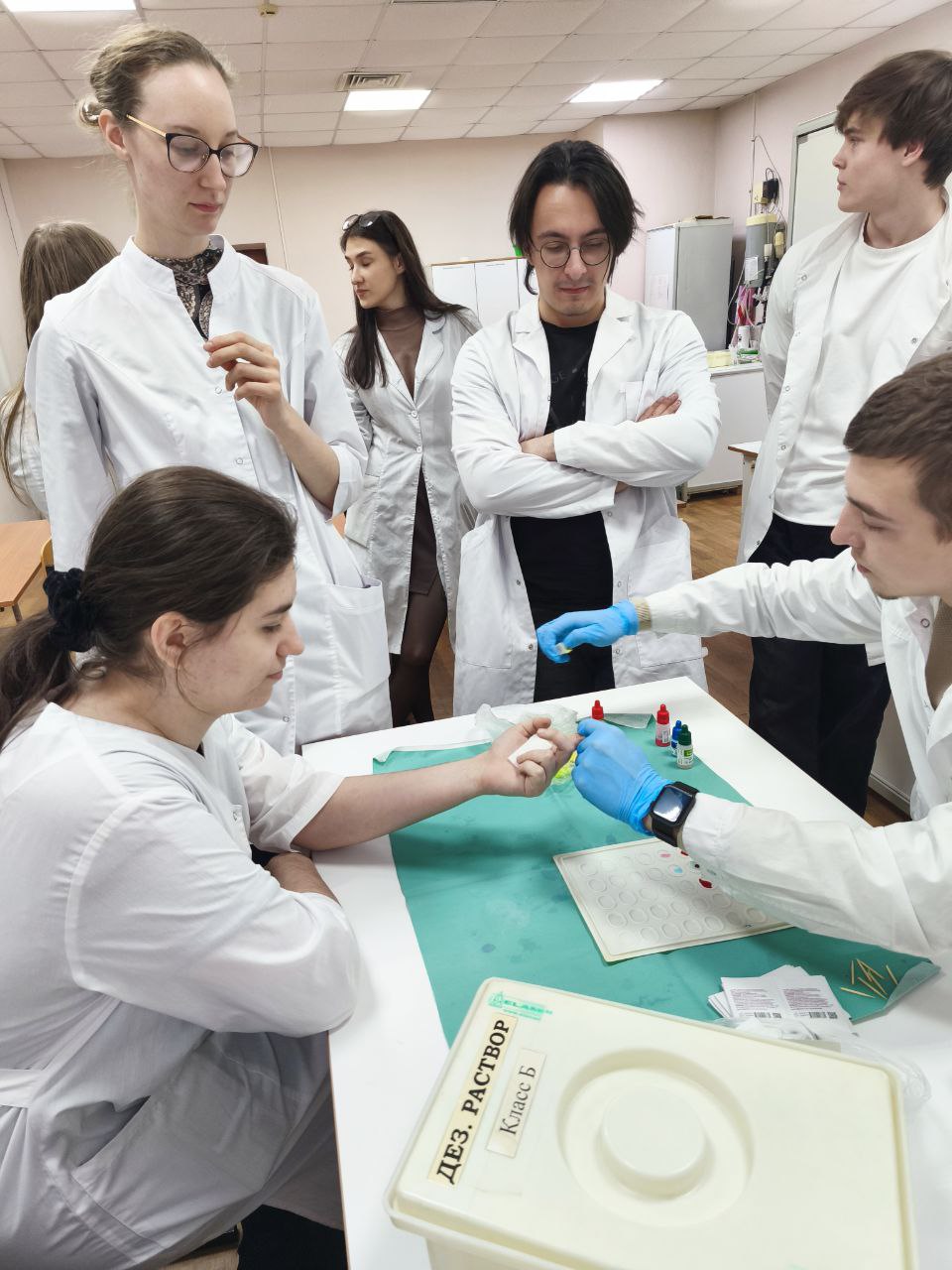 Студенты третьего курса, имеющие среднее специальное образование, Екатерина Бурмак и Максим Петров, совместно с младшими коллегами, закрепили теоретические знания по трансфузиологии, помогли отработать ключевые практические навыки, необходимые в экстренной клинической практике. Участники под руководством старших товарищей научились самостоятельно проводить забор капиллярной крови и интерпретировать реакцию агглютинации для точного определения группы крови.