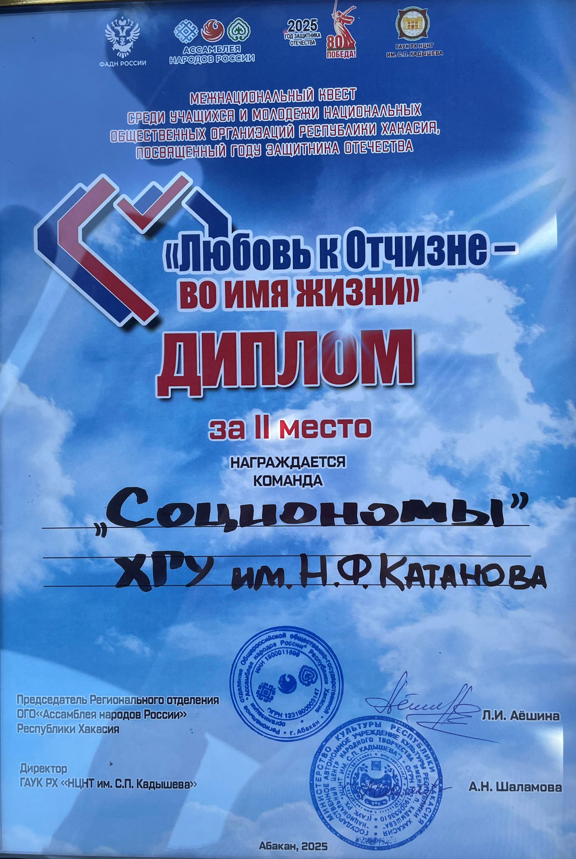 Студенты 4 курса направления подготовки «Социальная работа» приняли участие в Межнациональном квесте, который состоялся в Национальном центре народного творчества имени С.П. Кадышева 27 сентября «Любовь к Отчизне – во имя жизни». Квест был посвящен Году защитника Отечества и 80-летию со дня Победы в Великой Отечественной войне. Цель мероприятия – способствование формированию молодежного актива национальных организаций, укрепление единства российской нации, патриотическое воспитание молодёжи, воспитание уважительного отношения к истории Отечества, памяти ветеранов Великой Отечественной войны и участников СВО.В квесте приняли участие 8 команд молодежи в возрасте от 14 до 35 лет. Организаторами квеста выступили: Региональное отделение ОГО «Ассамблея народов России» Республики Хакасия и ГАУК РХ «Национальный центр народного творчества имени С.П. Кадышева».